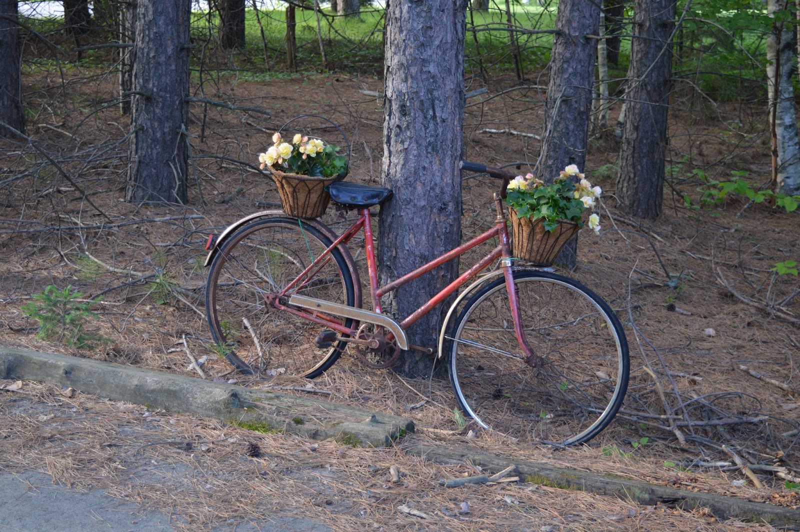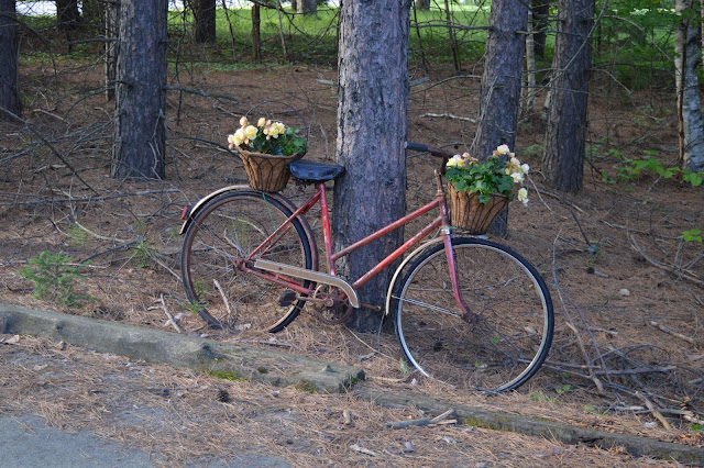 I added two baskets to the bike. I was all thumbs trying to attach them to the bike, but my husband did a very good job of it. He just used wire and secured them to the places that you would actually attach real baskets.